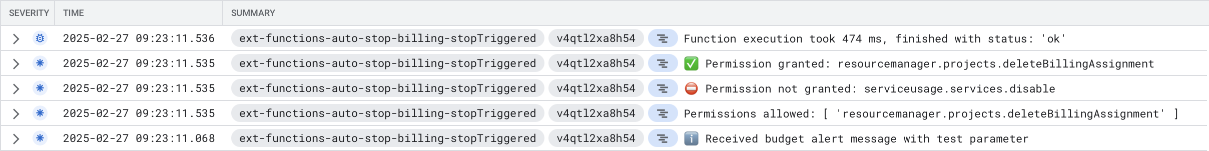 Below is the log output when sending the test message. Note that this specific example is for Strategy 1 only which requires the Project Billing Manager role, while the Service Usage Admin role is not required.